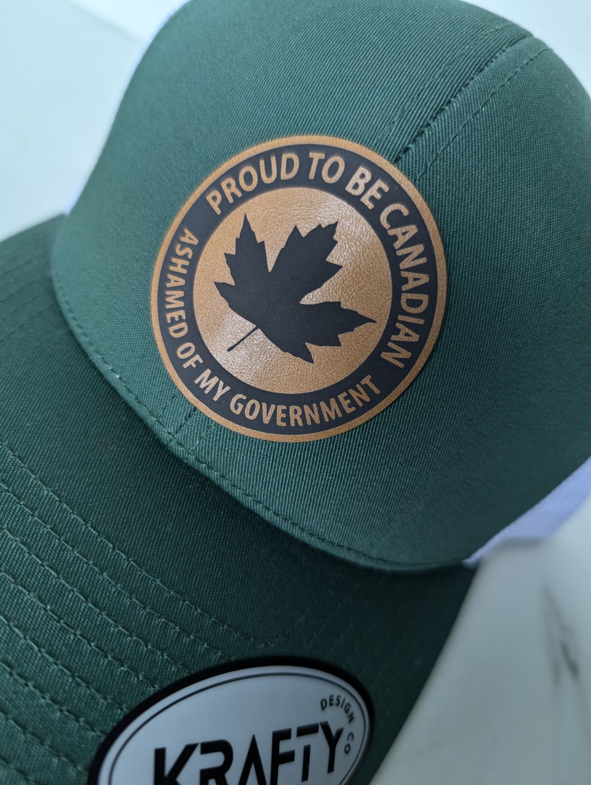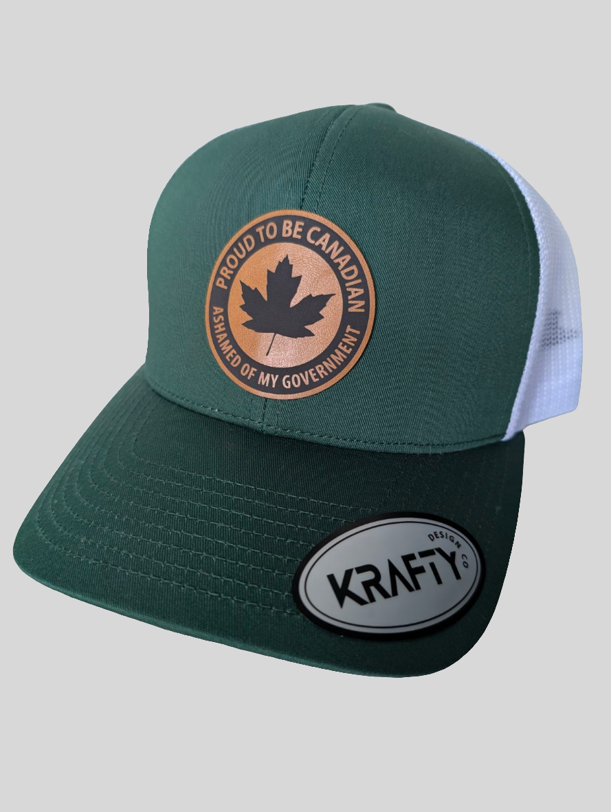 PROUD TO BE CANADIAN ASHAMED OF MY GOVERNMENT leather style patch trucker hat